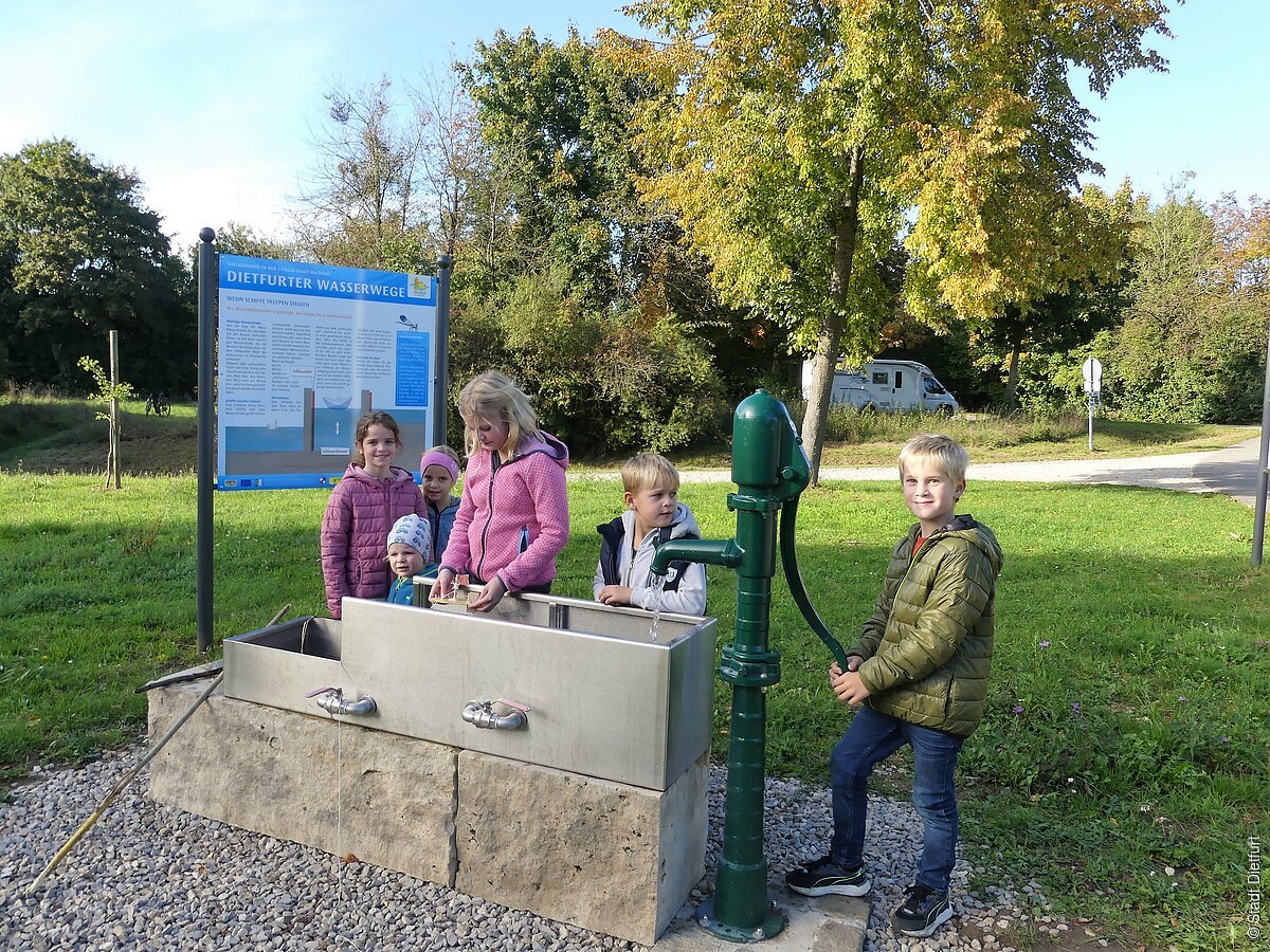Die Info-Tafel "Wenn Schiffe Treppen steigen" erklärt wie eine Schleuse funktioniert und wie wichtig diese im Schiffsverkehr sind. Am Schleusenmodel mit Schwengelpumpe können Kinder ausprobieren wie eine Schleuse arbeitet.
