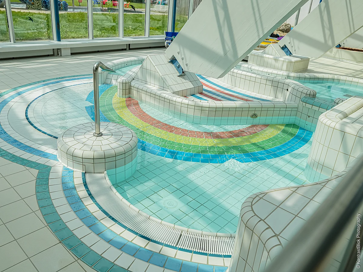Für die Kleinsten bietet das Planschbecken mit Schiffchenkanal, in dem ein Wasserfall plätschert und ein Schwanenhals Wasser speit, großes Badevergnügen. Jeden Mittwoch ist zudem Kindernachmittag, bei dem man auch mit Luftmatratze und Schlauchboot das Hallenbad entern kann.