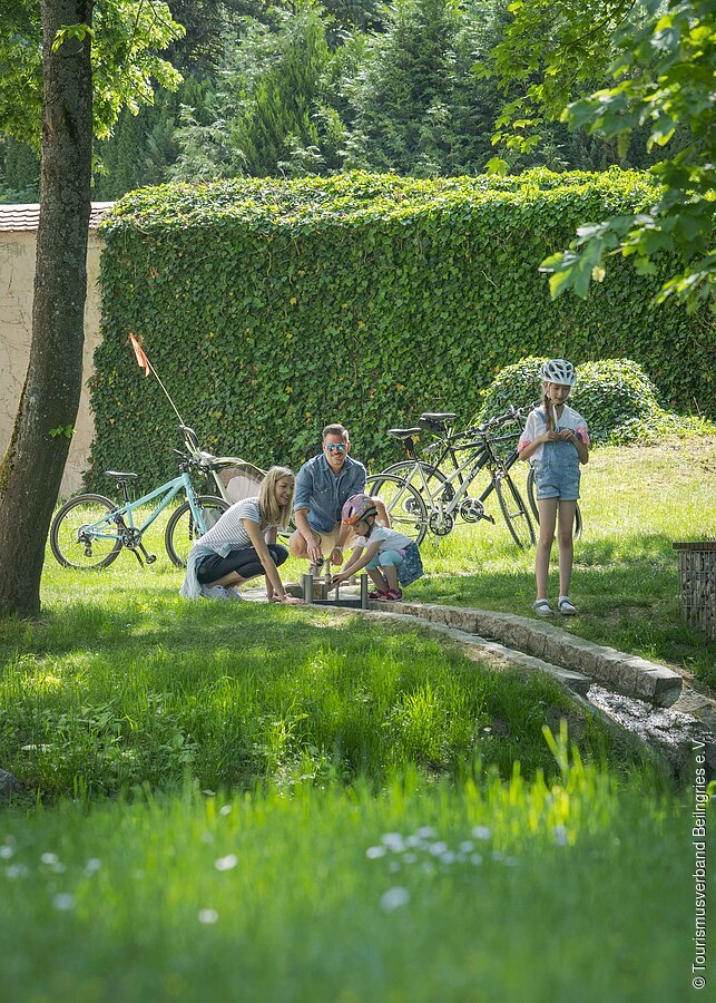Die historische Gösselthalmühle liegt mitten in einem Park mit altem Baumbestand. Passend zur Ausstellung wurden hier Spielmöglichkeiten für Kinder eingerichtet: ein Klettergerüst, das Holzschiff „Archimedes“ und eine Wasserschnecke, mit der sich Wasser aus dem Bach Sulz holen lässt. Wer möchte, macht Rast an einer der Sitzgruppen.