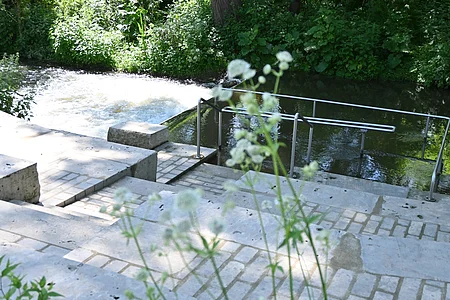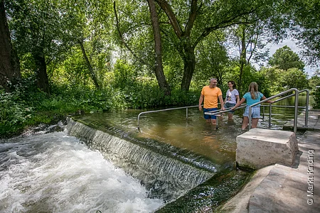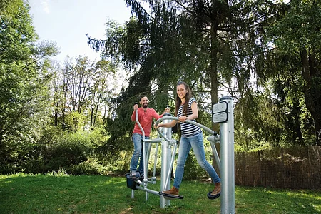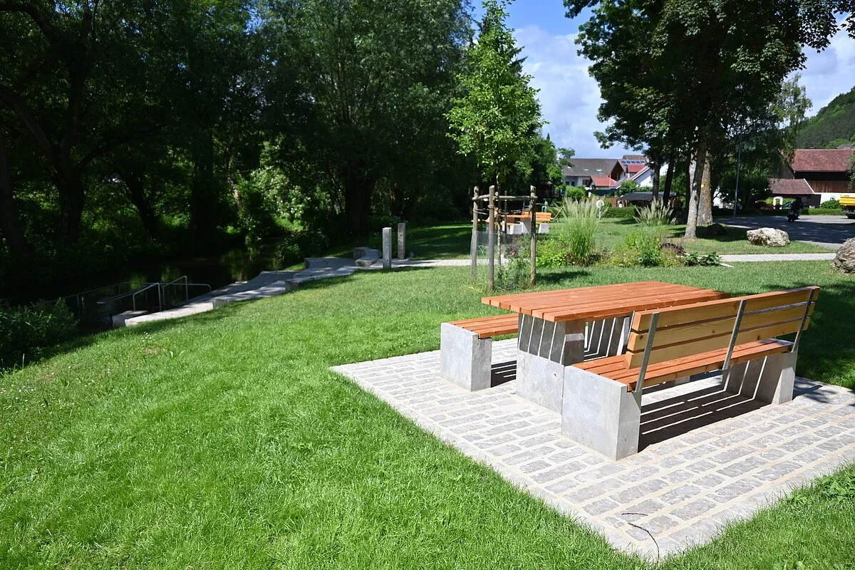 Die Wassertretanlage in Kinding - eine wohltuende Erfrischung für die Beine nach einer Wanderung, Radltour oder Nutzung unserer Fitnessgeräte. Sitzgruppen und Waldsofas laden unter Schatten spendenden Bäumen zum gemütlichen Verweilen ein.