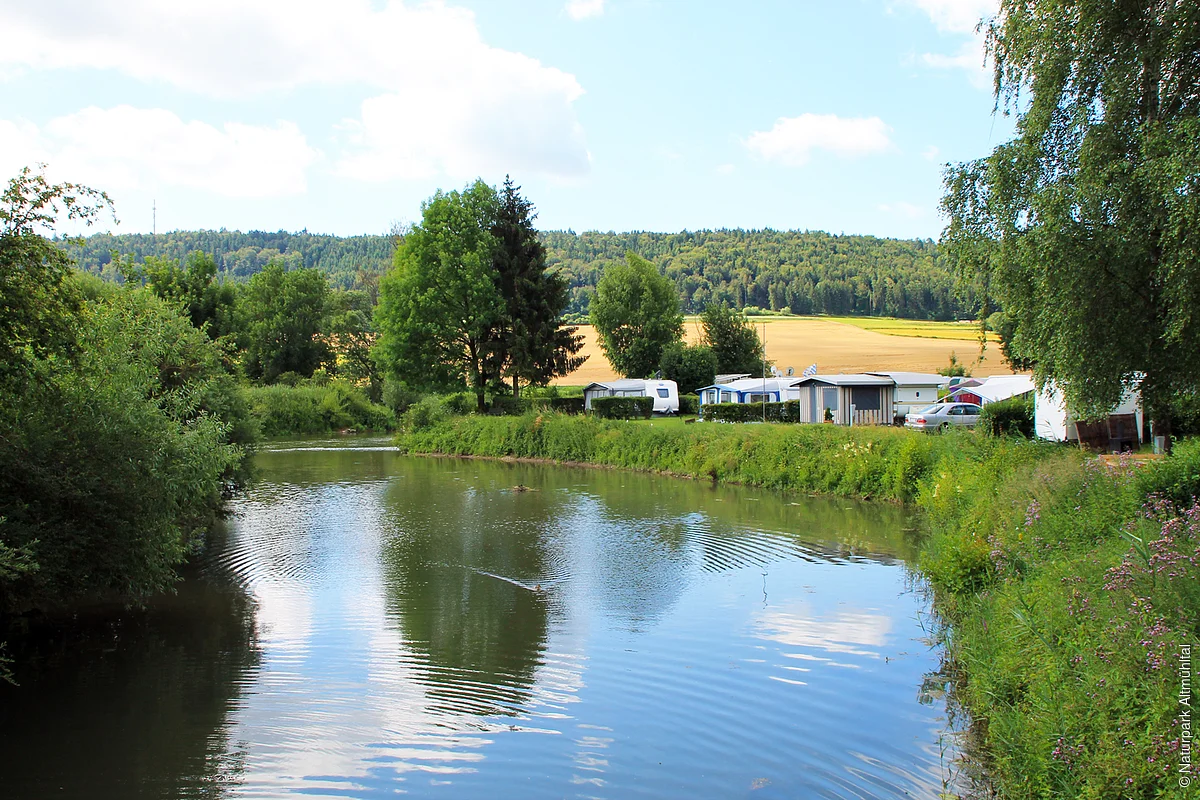 Inmitten von Bäumen und direkt an der Altmühl liegt der rund 30.000 Quadratmeter große Campingplatz mit Bayerns 1. FassHotel, SchäferwagenDorf und TinyHausHotel.