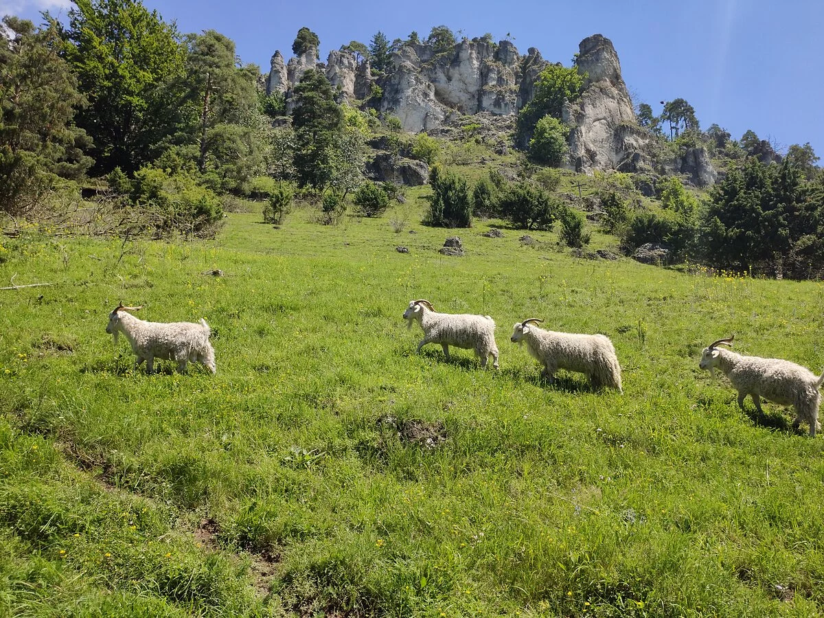 Mit etwas Glück trifft man auf eine Angoraziege aus der Herde, die im Rahmen des Projektes "Extensive Ganzjahresbeweidung der Arnsberger Leite“ einen großen Teil des Steil- und Felsenhangs beweidet. Für die Wanderer auf dem Altmühltal-Panoramaweg, der mitten durch die Leite führt, gibt es selbstschließende Tore (Einhegung des Hangs durch Elektrozäune).