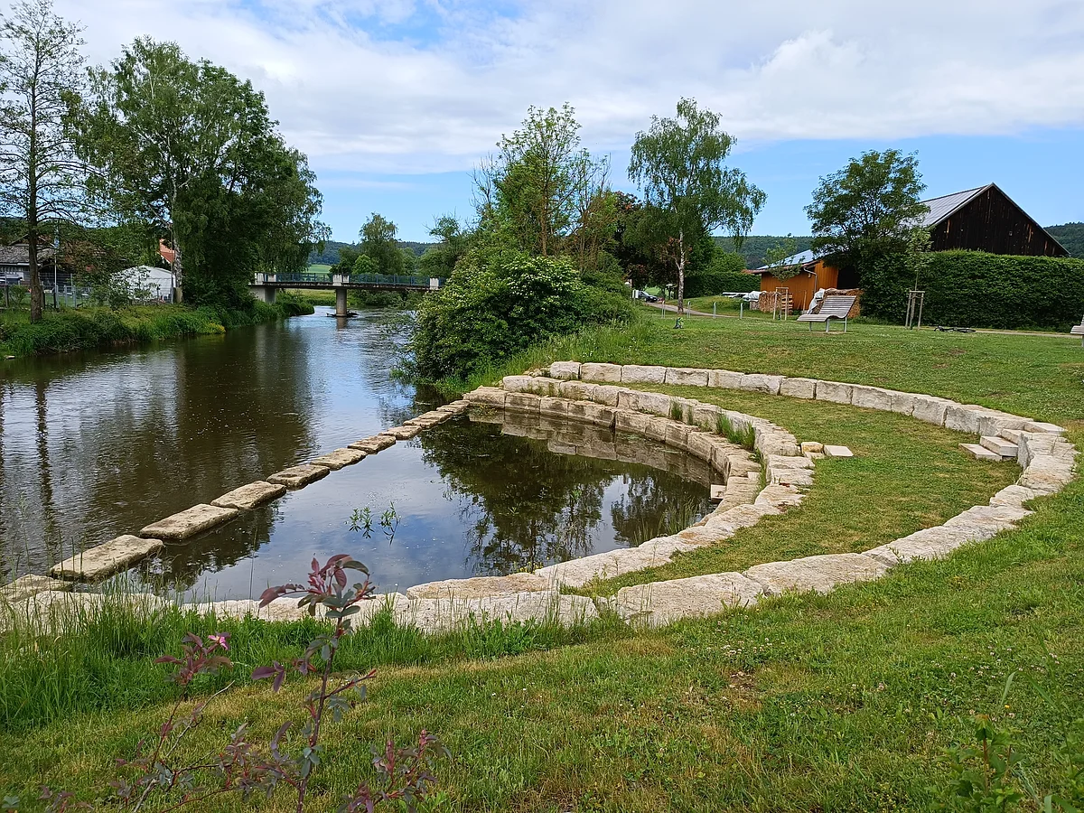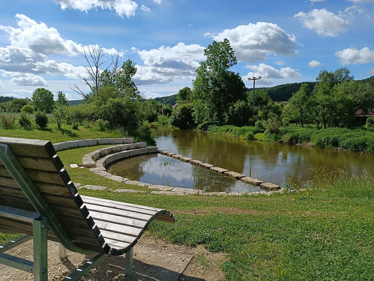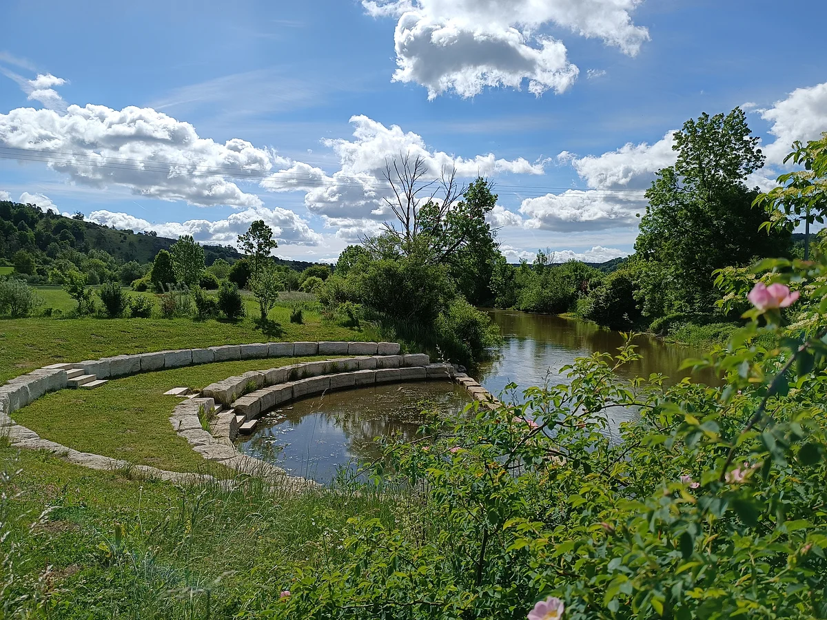 Wie ein antikes Amphietheater schmiegt sich die Entschleunigungsstation mit ihren Sitzbänken aus Jurastein in Pfalzpaint ans Altmühlufer. Die Bühne gehört hier dem Wasser, das in seinem eigenen Tempo in das Halbrund hinein und wieder heraus strömt. Hier lässt es sich gut rasten, Wasservögel und Kanufahrer beobachten und mit anderen Radlern, Wanderern oder Spaziergängern ins Gespräch kommen.