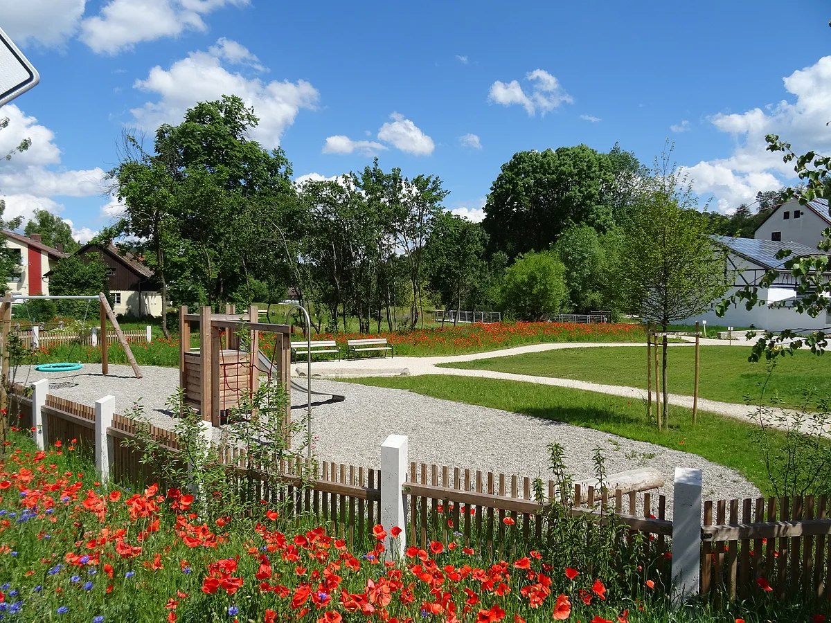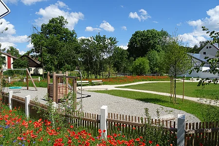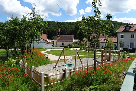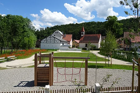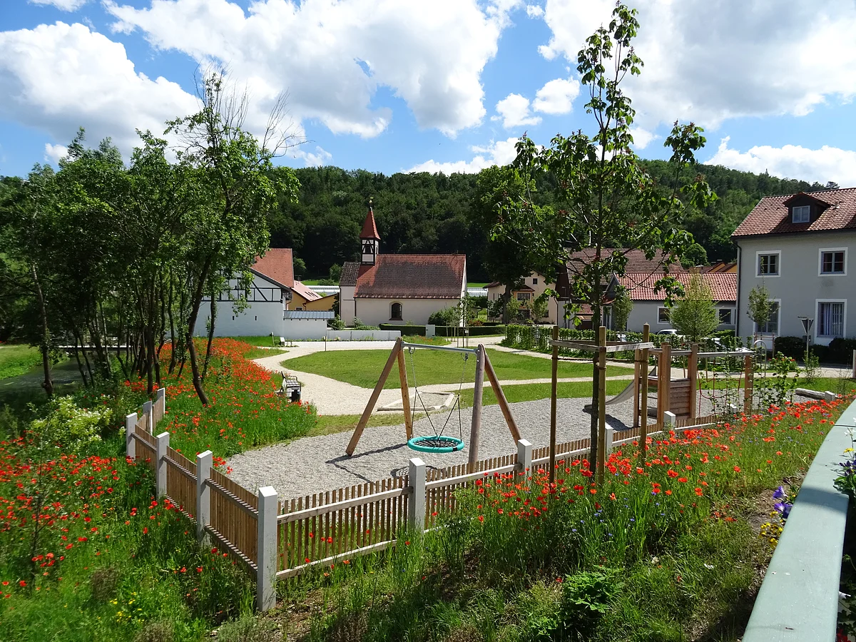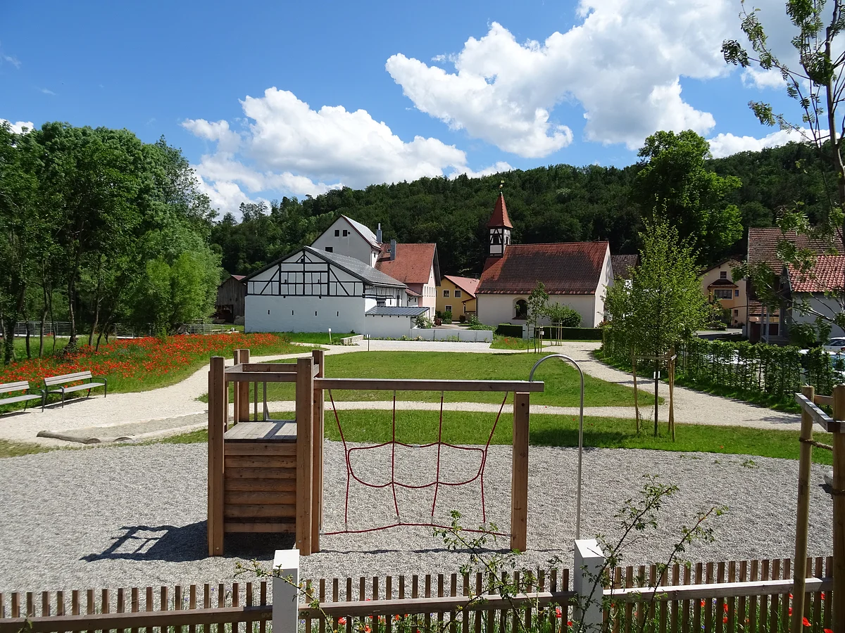 Das naturräumliche Potenzial der Anlauter und des abzweigenden Mühlbachs wird durch Fußwege, Brücken, Blickachsen und Sitzplätze aufgewertet. Hier trifft die Auenlandschaft mit dem kulturellen Erbe der benachbarten Mühle, der Kapelle und der historischen Dorfsiedlung zusammen.