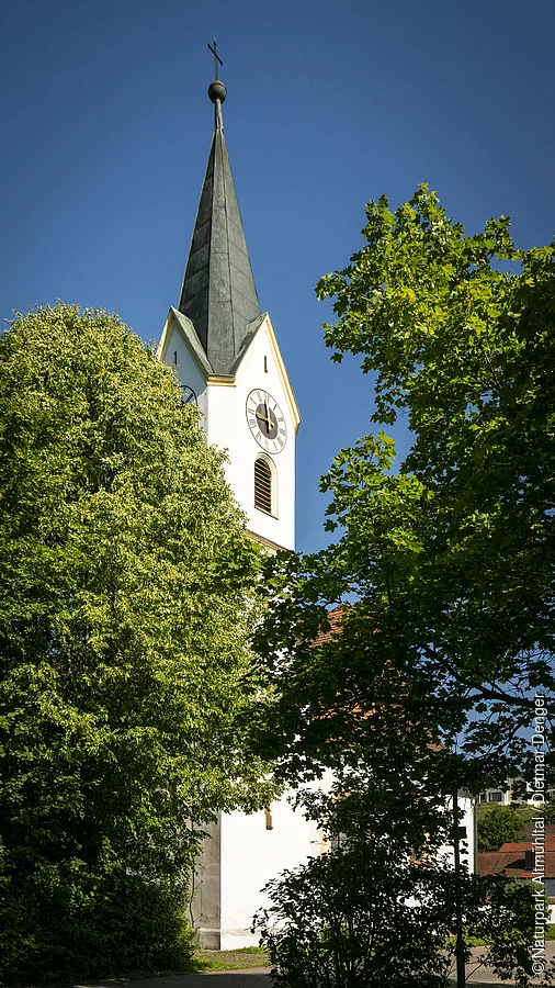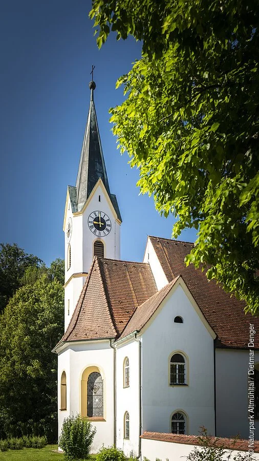 Aus den Vorgängerbauten der heutigen Barockkirche stammen der romanische Taufstein (12. Jh.) an der Kirchenrückwand, ein aus rotem Ton gebranntes Kruzifix um 1400 am Chorbogen und ein Holzrelief der hl. Anna selbdritt um 1500 auf dem rechten Seitenaltar. An den Kirchenwänden befinden sich zahlreiche Grabsteine und Epitaphien der Familie von Muggenthal: Die Muggenthaler, Besitzer der benachbarten Schlösser Neuenhinzenhausen (1557 bis 1704), Sandersdorf (1425 bis 1646) und Hexenagger (1528 bis 1724) hatten hier seit 1471 ihre Familienbegräbnisstätte. Besonders bemerkenswert sind die Grabsteine des Heimeran Muggenthaler (gest. 1471) an der Kirchenrückwand und des Heinrich von Muggenthal (gest. 1519) an der rechten Langhauswand; beide Steine zeigen die Verstorbenen in voller Rüstung in flachem Relief.