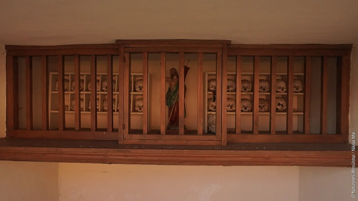 So schmücken den Hochaltar, der dem Stil nach vom Ende des 17. Jh. stammt, zwei spätgotische Seitenfiguren (Spätzeit des 15. Jh.), links der Kirchenpatron St. Johannes Ev., rechts St. Sebastian. In der Frühzeit des 16. Jh. wurden die Holzfiguren zu beiden Seiten des Chorbogens geschaffen: rechts St. Leonhard mit Buch und Stab, links Maria mit dem Jesuskind, das einen großen Kreuznagel hält und damit auf sein zukünftiges Leiden hinweist; die Statue hatte ursprünglich ihren Standort in der Leonhardikapelle in der Ortsmitte, über deren Eingang auch die Steinfigur des hl. Leonhard (bez. 1603) stand, die sich jetzt an der linken Langhauswand der Pfarrkirche befindet.