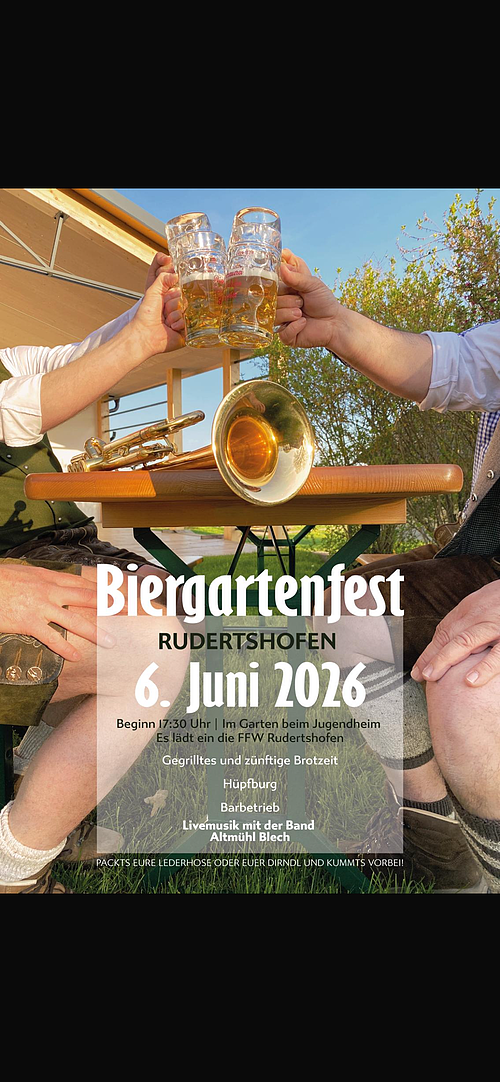 Im Garten beim Jugendheim findet das Biergartenfest ab 17:30 Uhr statt. Gegrilltes, zünftige Brotzeit, Hüpfburg, Barbetrieb und Livemusik mit der Band Altmühl-Blech erwartet Euch.