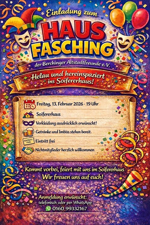 Premiere im Soifererhaus! Die Berchinger Altstadtfreunde laden herzlich zum ersten Kappenabend ein! Freut Euch auf einen schwungvollen Faschingsabend mit Musik, Tanz und närrischer Stimmung in geselliger Runde. Ob Kappe, Kostüm oder einfach gute Laune - alles ist willkommen!