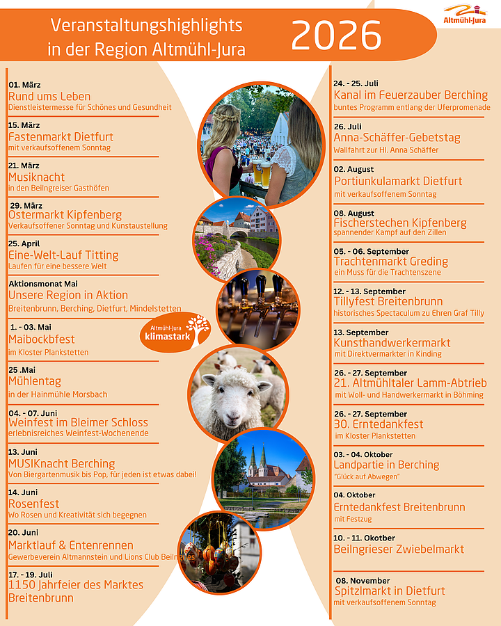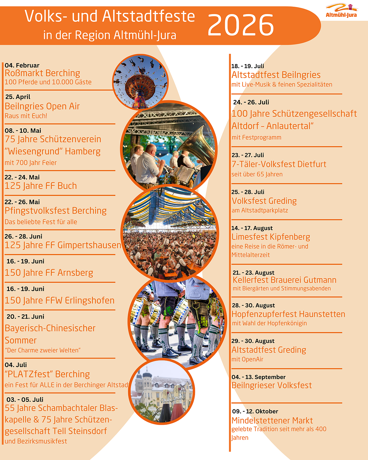Das ganze Jahr über ist in der Region Altmühl-Jura richtig viel los: Feste, Feiern und Märkte, Jubiläen, Konzerte und Erlebnisveranstaltungen reihen sich dicht an dicht. Wir haben hier für Sie eine ausgewählte Übersicht zusammengestellt zu allen Volks- und Altstadtfesten sowie zu allen regionalen Veranstaltungshighlights für das Jahr 2026.