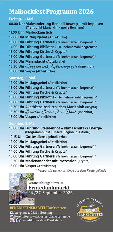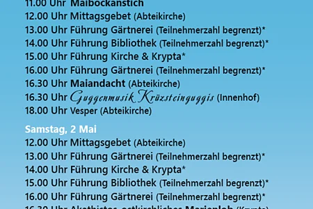 Highlights sind die Auftritte der Krüzsteinguggis Oberried und der Bourbon Street Jazz Band, der Jungpflanzenverkauf der Klostergärtnerei, musikalische Maiandacht und viele Führungen sowie Möglichkeiten zur Einkehr und Spiritualität.