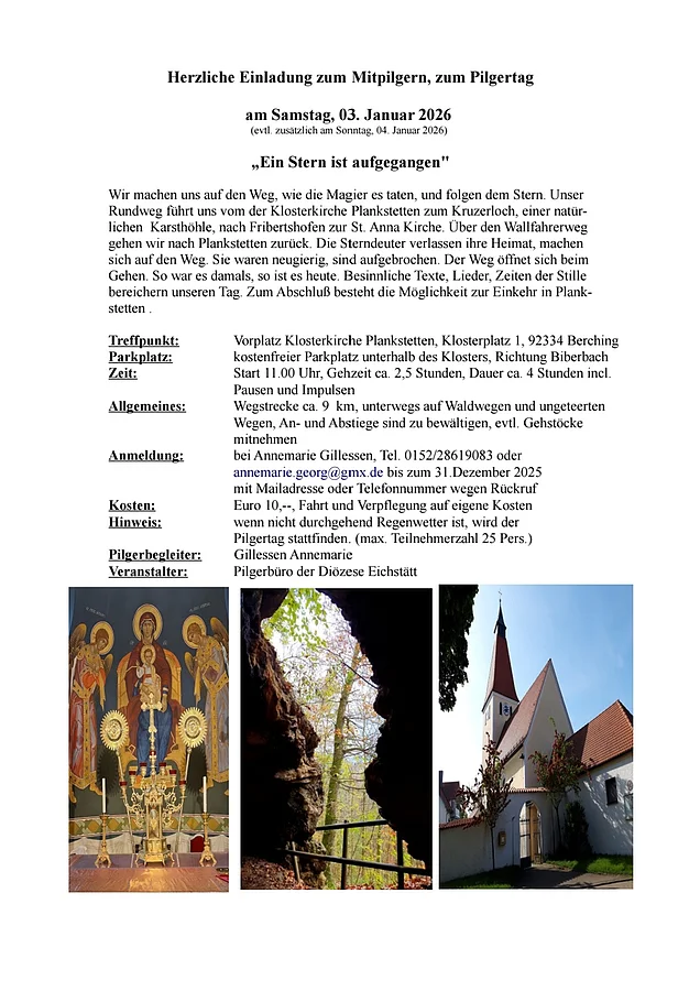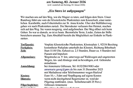 Wir machen uns auf den Weg, wie die Magier es taten und folgen dem Stern. Unser Rundweg führt uns von der Klosterkirche Plankstetten zum Kruzerloch, einer natürlichen Karsthöhle, nach Fribertshofen zur St. Anna Kirche. Über den Wallfahrerweg gehen wir nach Plankstetten zurück. Die Sterndeuter verlassen ihre Heimat, machen sich auf den Weg. Sie waren neugierig, sind aufgebrochen. Der Weg öffnet sich beim Gehen. So war es damals, so ist es heute. Besinnliche Texte, Lieder, Zeiten der Stille bereichern unseren Tag. Zum Abschluss besteht die Möglichkeit zur Einkehr in Plankstetten.