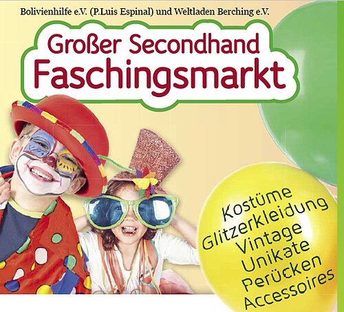 Gemeinsam mit dem Weltladen Berching e.V. und der Bolivienhilfe Berching veranstaltet die aktion hoffnung in Berching wieder einen Secondhand-Faschingsmarkt. Große und kleine Faschingsfreunde erwartet eine Auswahl von mehr als 2.000 Kostümen und dazu passende Accessoires zu jedem Thema.