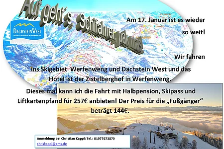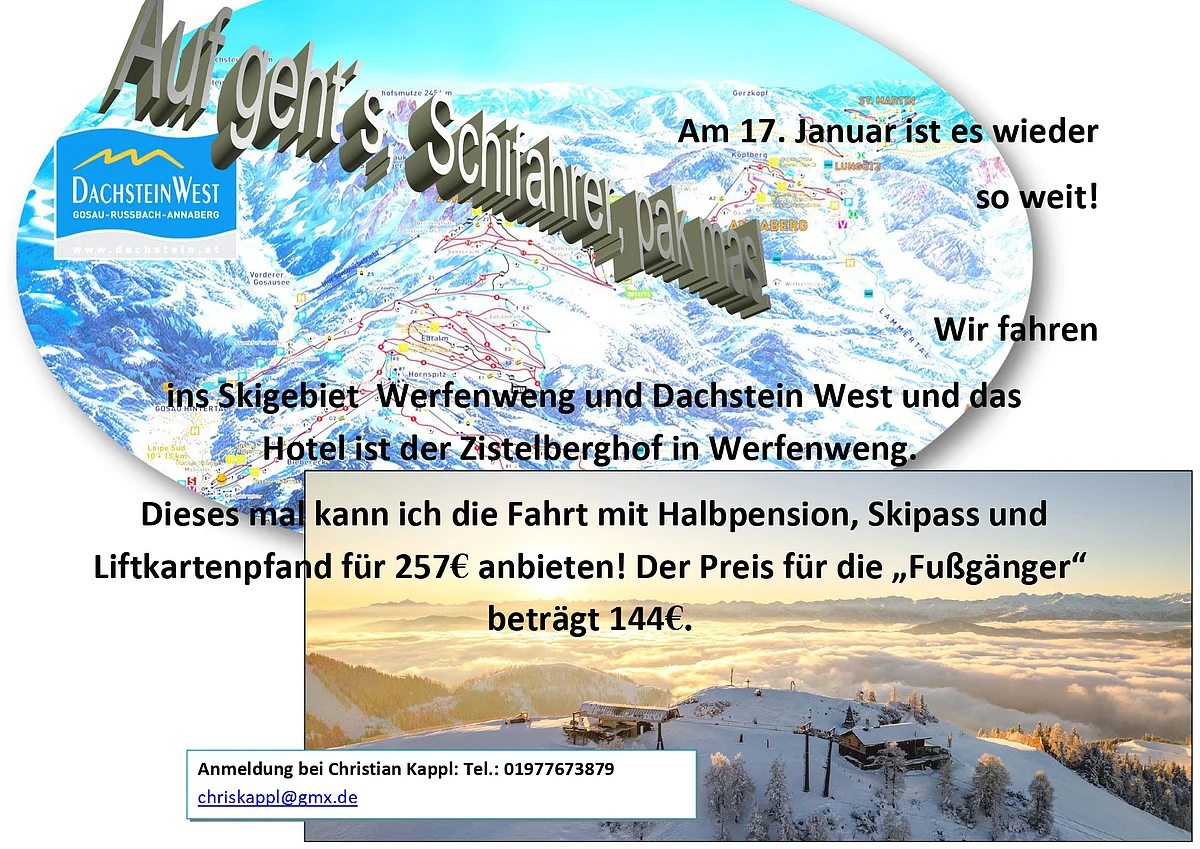 Wir fahren am Samstagmorgen um 4:30 Uhr früh ins Skigebiet Werfenweng und Rossbach am Skigebiet Dachstein West. Fahrt mit Hotel und Liftkarten für 257 Euro. Wir schlafen im Hotel Zistelberghof in Werfenweng im Salzburger Land.