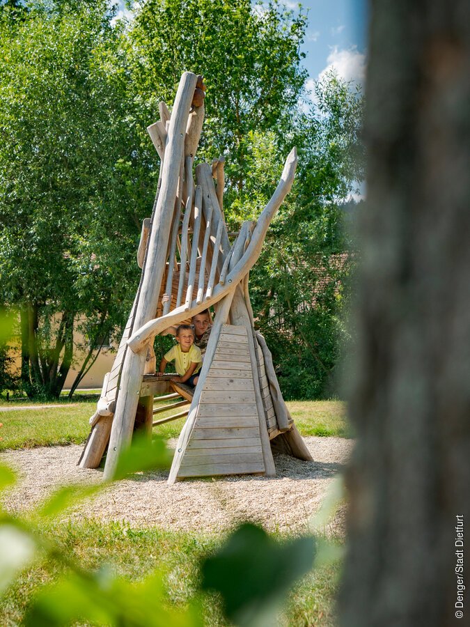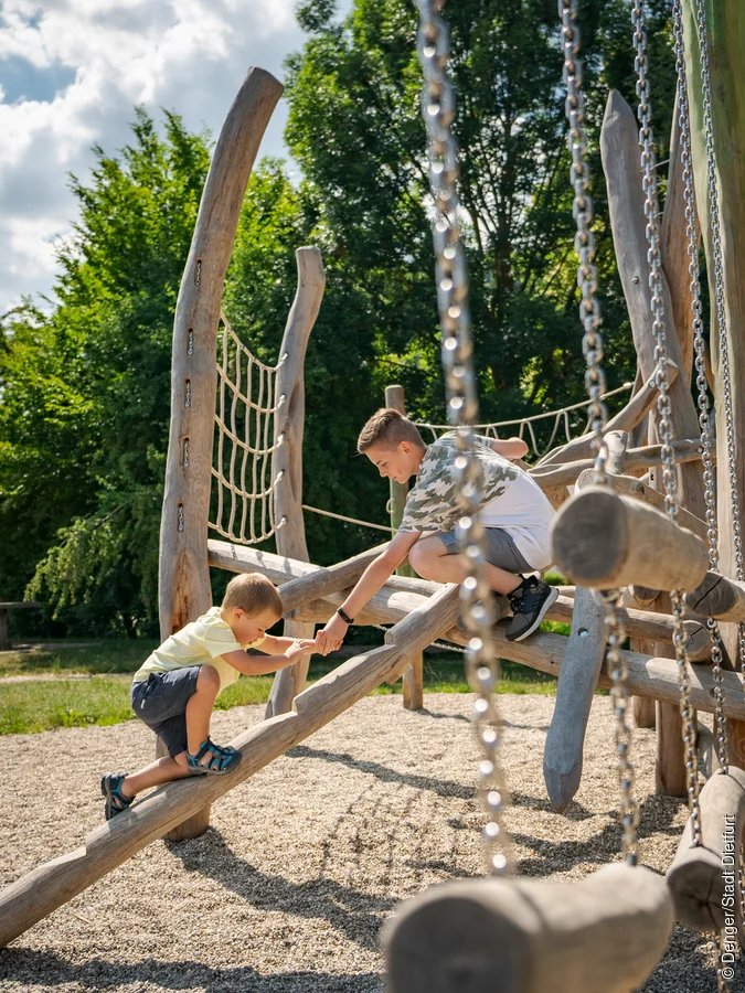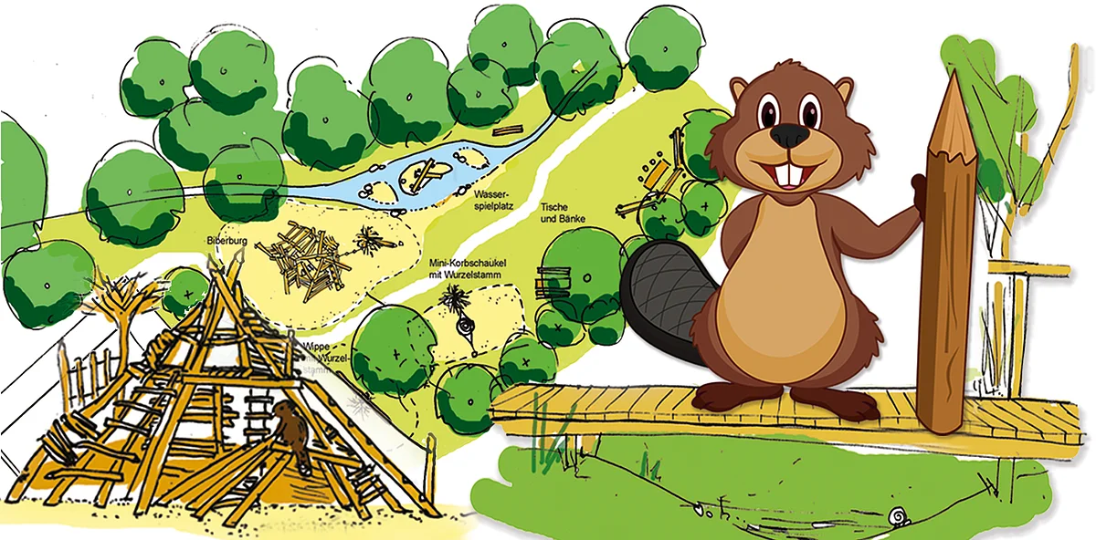 Der Biberspielplatz gliedert sich in einen Aktivbereich für größere Kinder mit Kletterwald und Riesenschaukel und in einen Spielbereich für jüngere Kinder mit Biberburg, Wasserspielplatz, Nestschaukel und Wurzelwippe.