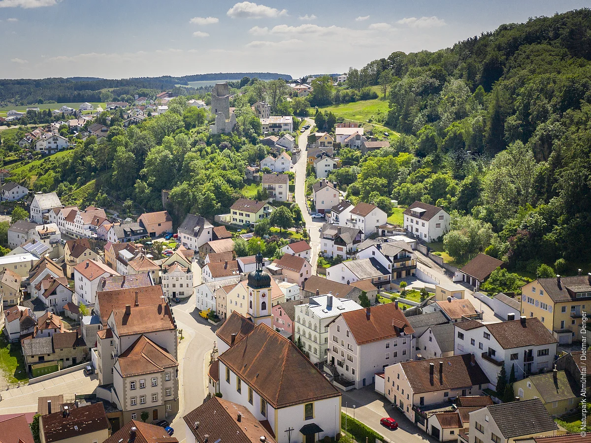 Vom großen Parkplatz in der Bahnhofstraße geht es die Treppen hoch zur Ulrich-von-Stein-Straße. Hier gelangen Sie aus dem Ort Altmannstein zum Höhenweg. Entlang der Wacholderheiden sehen Sie die Burg Altmannstein sowie einen Trockenrasenhang mit seltener Flora und Fauna. Sie gehen den Höhenweg hinunter und überqueren die Schambach zum Kreutberg. Der Kreutberg ist als Naturschutzgebiet ausgewiesen. Bergauf gelangen Sie auf der Anhöhe auf eine Sitzgruppe für eine Rast mit herrlicher Aussicht. Rechts hinab gehen Sie ins Tal und von dort aus links zwischen Schlehenhecken entlang von Feldern wieder zum Ort Altmannstein. Bei der Burg lohnt es sich noch am Aussichtsturm einen Blick auf den schönen Ort Altmannstein zu werfen. Von der Burg aus über die Burg-Stein-Gasse kommen Sie wieder zum Ausgangspunkt am Parkplatz zurück.